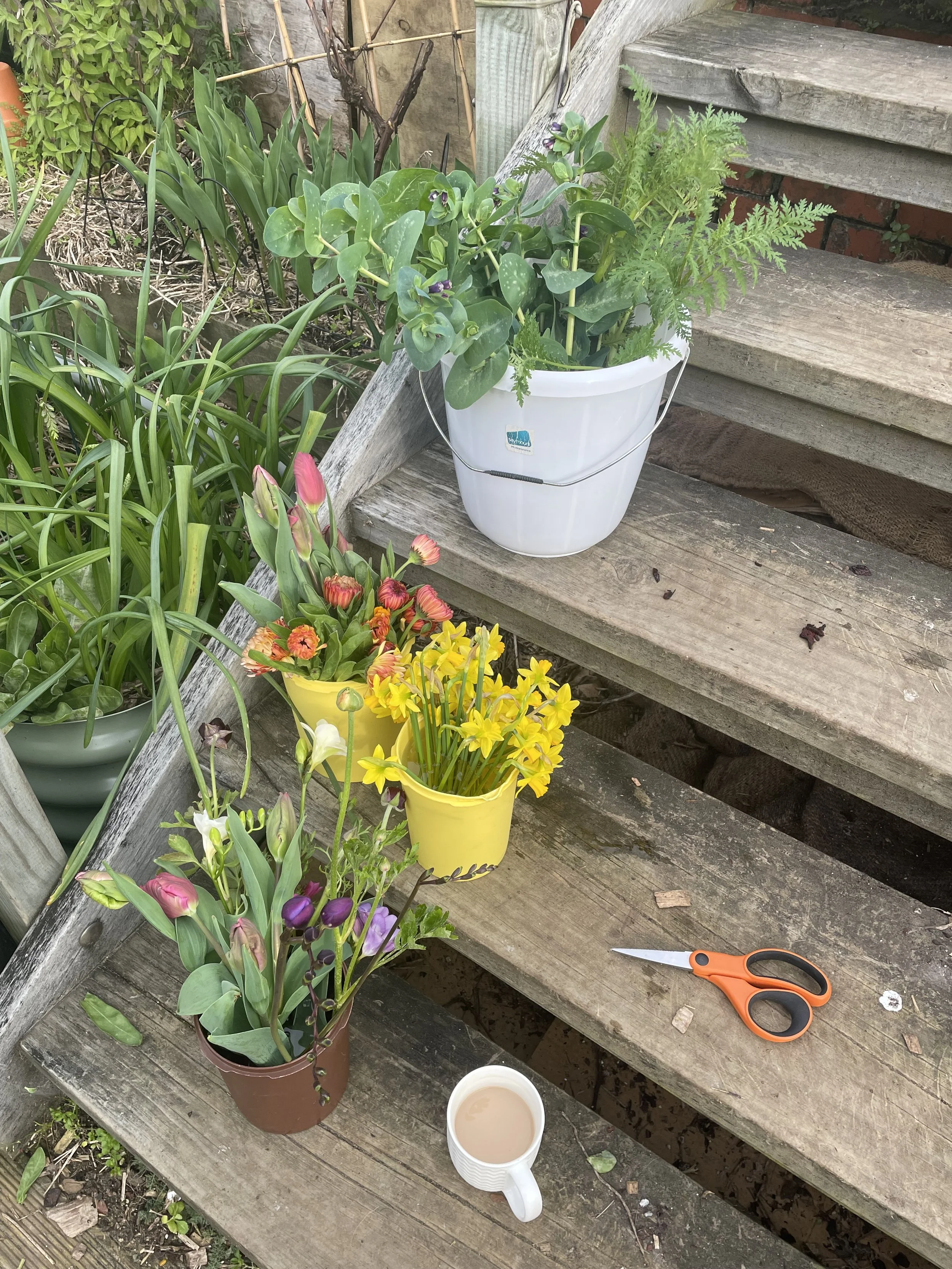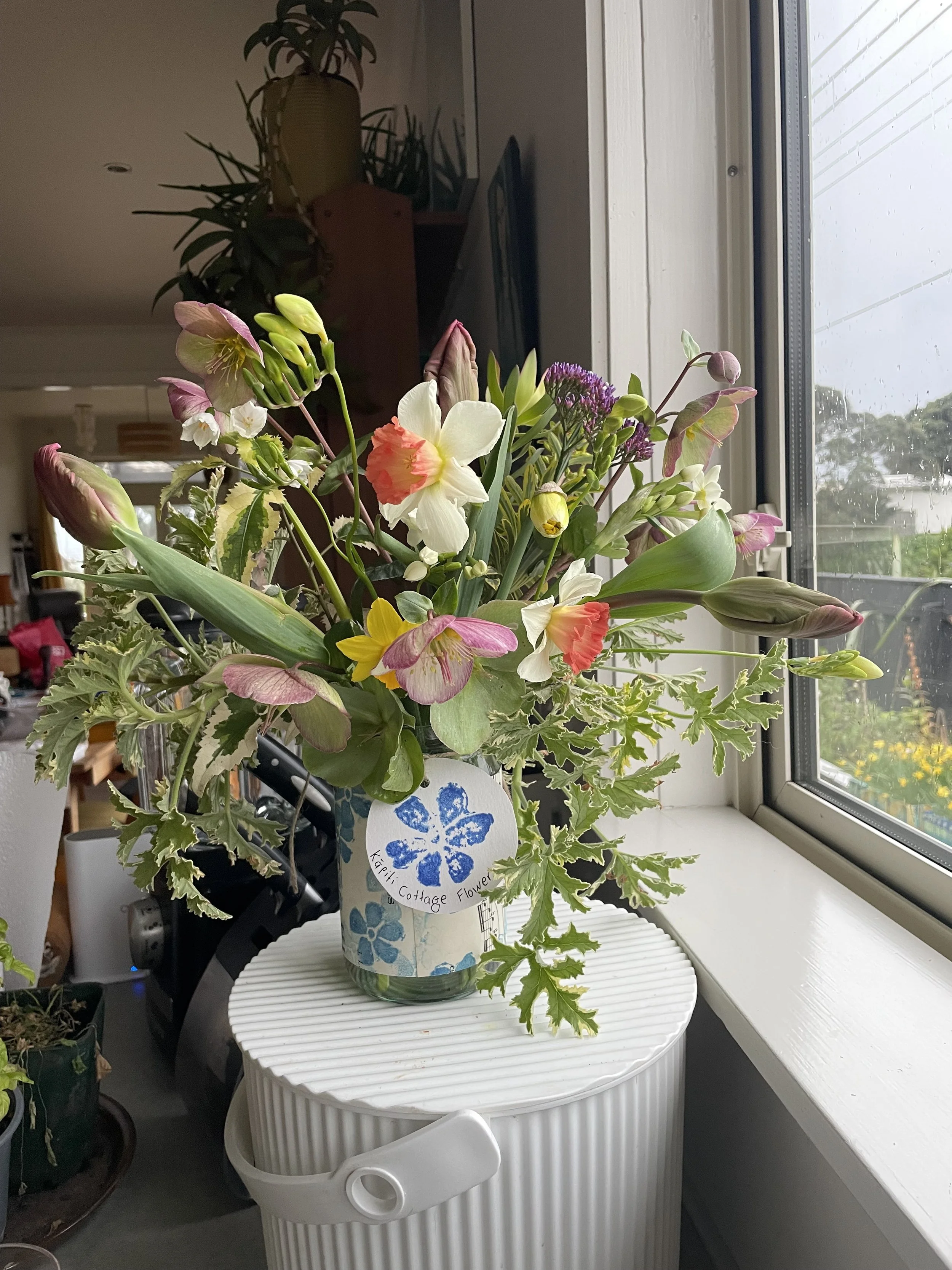 And because of the tulips I had to quickly get my roadside flower stall ready. It opened last week. At the moment I’m opening it every day and putting out a couple of large bunches in jars.