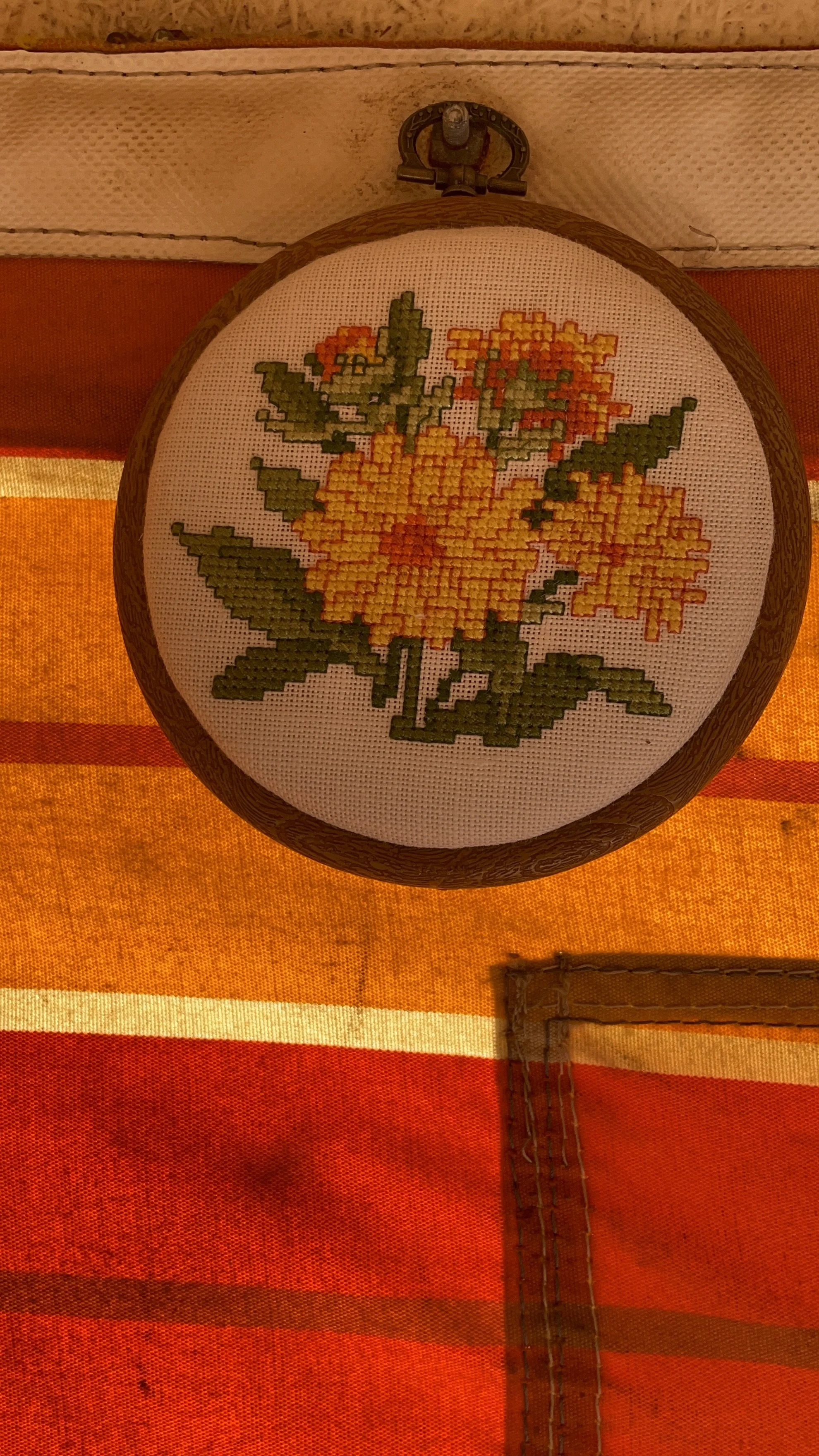 My friend Marion embroidered some marigolds to hang on a hook in Marigold. Love it.