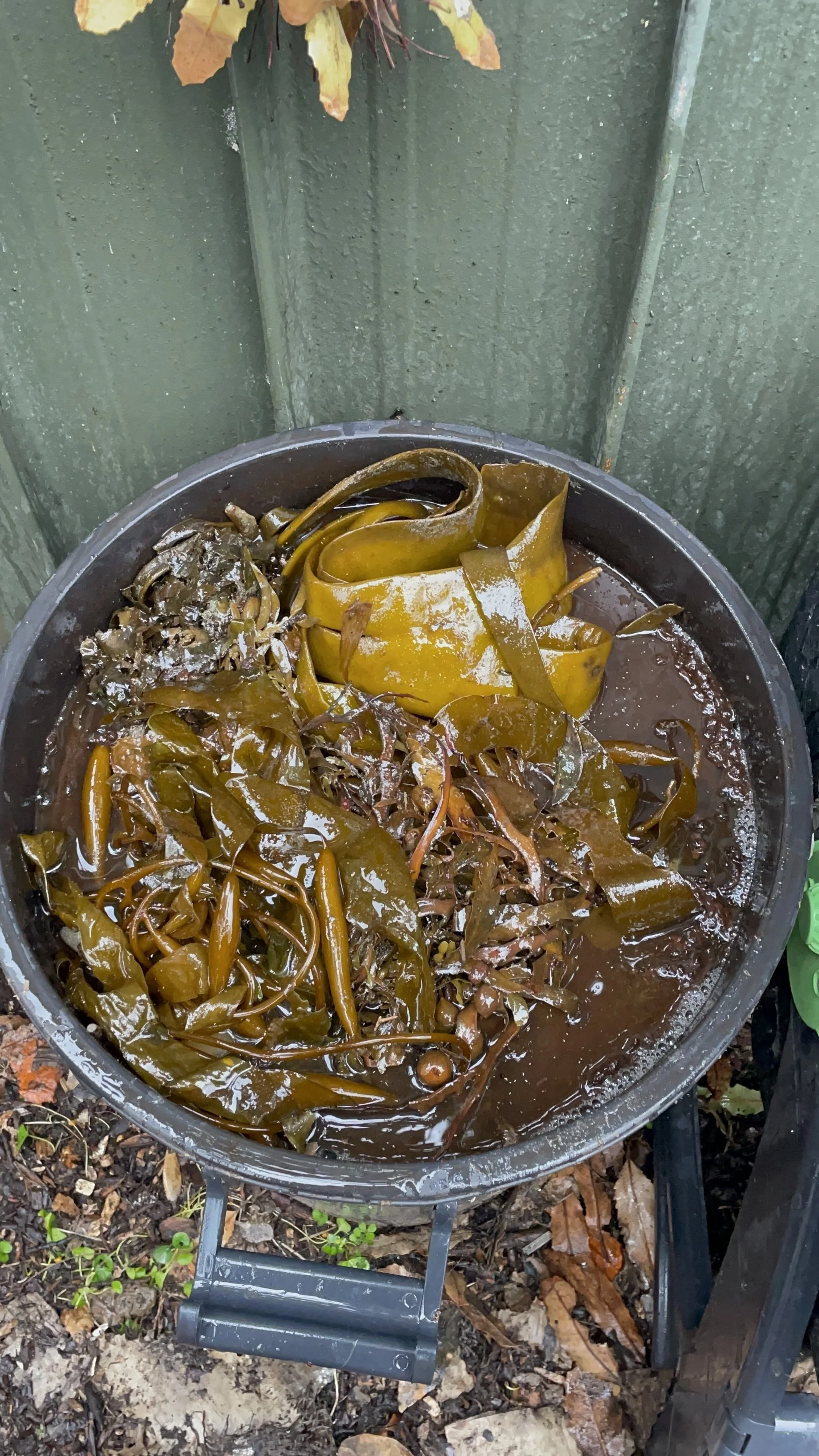 I finally got around to spraying my seedlings with my homemade comfrey and seaweed tea. I collect and store comfrey and seaweed in 2 plastic bins, one for each. I keep adding fresh seaweed and comfrey as it comes to hand, adding water. I collect the seaweed from the beach and the comfrey from my garden. I combine both brews in a container and pour it, along with lots of water, into my battery operated sprayer (best investment I’ve made).