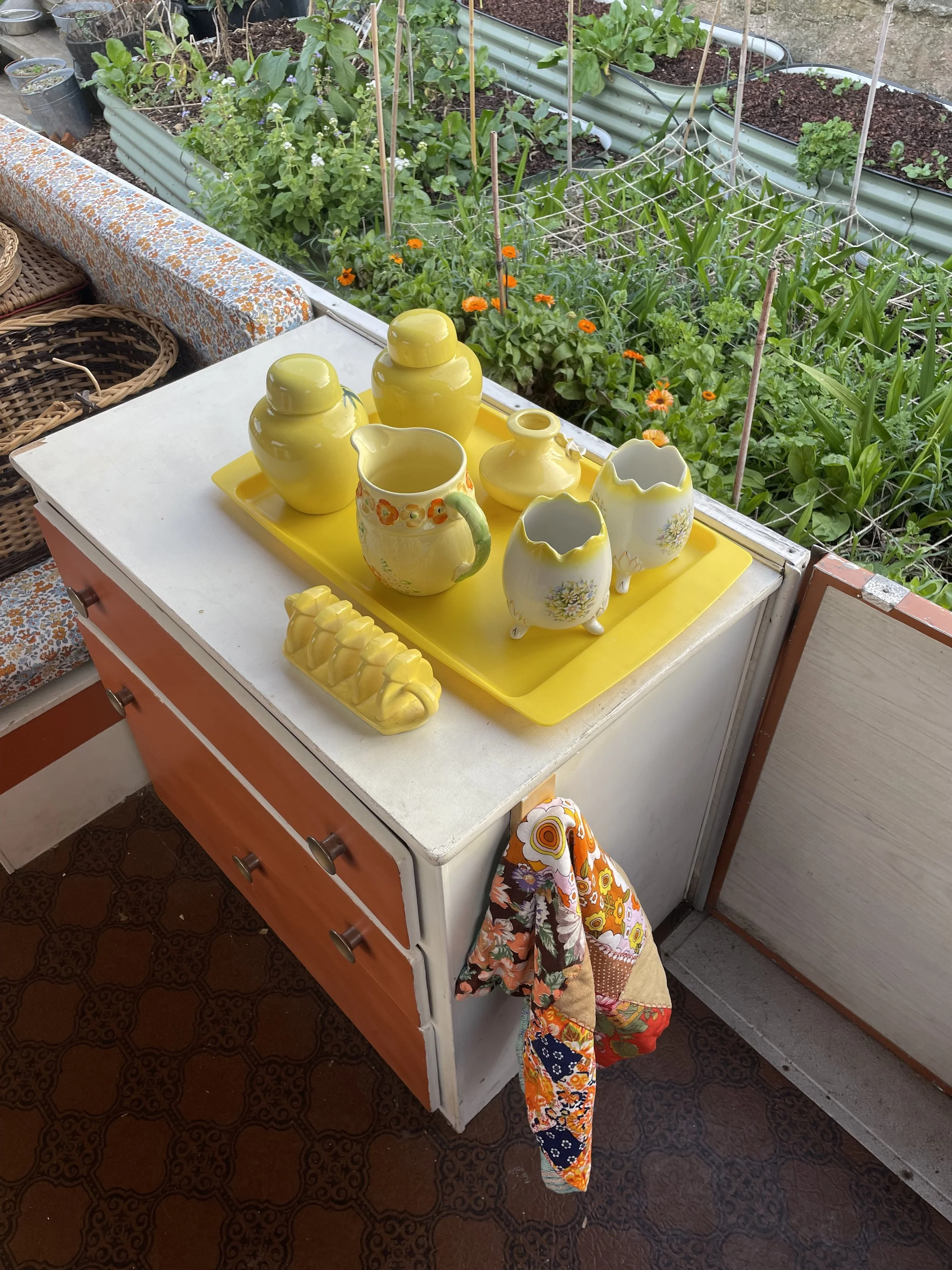 I’m going to use my vases. Orange, yellow, blue and white ones. I'm going to use wicker baskets and trays to display the vases with flowers in.